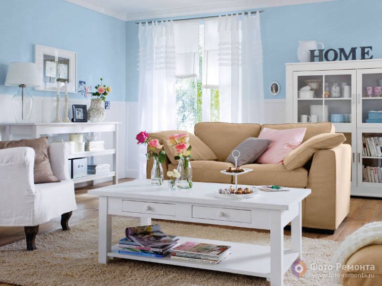 Стойкие ассоциации синего со стихиями воды и воздуха являются причиной того, что в данном цвете оформляют, как правило, ванные комнаты и спальни. Вместе с тем, при разработке интерьеров гостиных синие тона незаслуженно обходят вниманием. На самом деле, синий может смело соперничать с любым другим оттенком цветового спектра. Поверьте, что гостиная в средиземноморском стиле с главенствующим синим в ее дизайне будет не менее эффектной, чем, к примеру, комната в стиле хай-тек с преобладанием серых тонов. На первый взгляд синий производит впечатление холодности и мрачности, но стоит разбавить его теплыми цветами, как пространство гостиной буквально на глазах приобретает небывалый уют и доброжелательность. Синий обладает большим количеством оттенков, среди которых голубой, бирюзовый, лазурный, васильковый и прочие. Чаще всего в интерьерах гостиных можно наблюдать насыщенный синий либо его голубые вариации. Оформляя комнату в глубоких синих тонах, важно чтобы в ней было достаточно естественного света. В затемненном пространстве данный цвет будет действовать угнетающе, провоцируя чувство подавленности и дискомфорта. В большинстве случаев синий лучше подавать дозировано. Дополните его розовыми, оранжевыми, желтыми, белыми, бежевыми, серыми или золотистыми вкраплениями и он раскроет вашему взору свои самые лучшие стороны. Светло-голубой интерьер станет лучшим решением для гостиной в стиле прованс. В такой комнате потолки будут казаться выше, а стены словно раздвинутся, высвобождая пространство из существующих границ. При этом нейтрализовать холодное настроение голубого помогут теплые тона – бежевый, песочный, молочный, оливковый и другие.