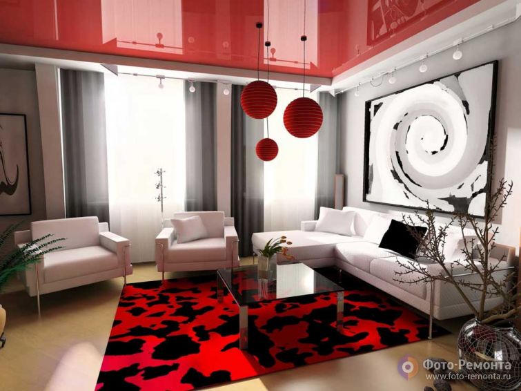 Вне всякого сомнения, красный цвет обладает мощным энергетическим зарядом. Его присутствие в гостиной создаст ощущение праздника, радости и веселья. Неспроста именно этот цвет со множеством его вариаций является одним из основных символов самого яркого праздника в году – Нового года. Независимо от присущего гостиной стиля, будь он классическим или современным, красный будет смотреться стильно и экстравагантно. Преобладание данного цвета в гостиных наших соотечественников можно увидеть крайне редко. Наряду с этим, смелые англичане оформляют монохромным красным достаточно большие поверхности комнаты, обрамляя их белыми деталями. Традиционная английская классика в интерьере – это однотонные красные стены, белые двери и плинтуса. В наших гостиных красному отдают, как правило, второстепенную роль. Оптимальным считается, если он занимает две трети от общего цветового дизайна. Обои с красно-белым орнаментом станут отличным штрихом классического интерьера, а красный диван или кресла гармонично впишутся в стиль хай-тек. Лаконичность красного в оформлении гостиной подразумевает использование данного цвета в небольших аксессуарах – подушках, пледах, коврах, шторах и т.д.