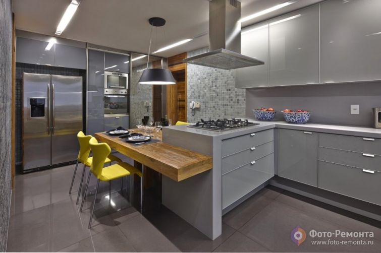 Кухня в сером исполненииСерый цвет, который принято считать безликим и скучным, может заиграть в дизайне кухни самыми яркими и неожиданными красками, стоит лишь найти ему правильного «компаньона». Вдобавок ко всему, многочисленные примеры эффектных интерьеров в стилях хай-тек, лофт и минимализм с базовым серым оформлением являются убедительным подтверждением того, что данный цвет – один из самых стильных и ультрасовременных. Серый можно смело использовать как на больших, так и на маленьких площадях кухонь. В комбинации с яркими оттенками он будет нейтральным, смягчающим фоном. Практичность и чистота серого привлечет педантичных хозяек, для которых порядок на кухне – превыше всего. Оттеночная палитра данного цвета пестрит вариациями – дымчатый, пепельный, хромовый, серо-голубой, серебристый и прочие. Светлые оттенки серого смотрятся уютнее и теплее. Слишком темных лучше вообще избегать. Серый цвет гармонично сочетается с белым, черным, голубым, оранжевым, желтым, розовым и коричневым. Серый цветовой дизайн кухни с серебристой бытовой техникой, мойкой и варочной поверхностью – это решение, то и дело встречающееся на страницах модных интерьерных изданий. Любой оттенок данного цвета может быть использован и в классическом оформлении кухонь. Тогда, скажем, однотонные серые стены должны подчеркивать утонченность бежевого или белого кухонного гарнитура.