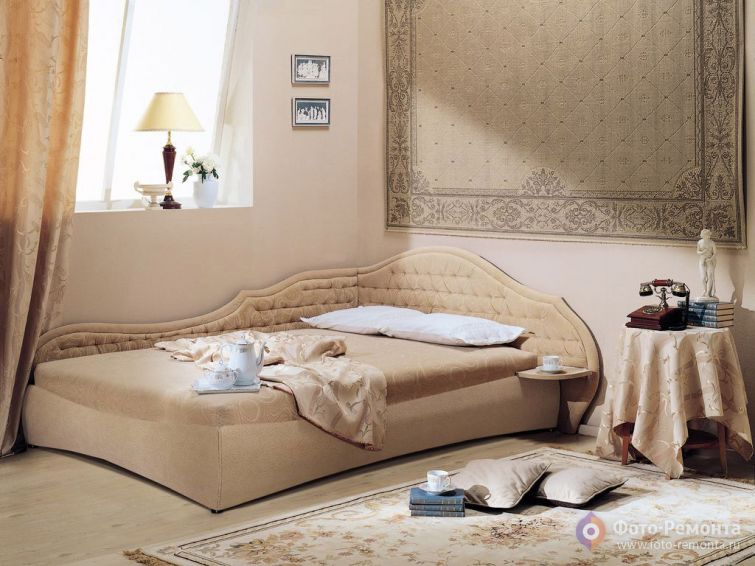 Корпус тахты угловой изготовлен из массива дерева в комбинации с фанерой, обтянут тканью или кожзаменителем. Высота спального места 420 мм. Имеется ящик для белья