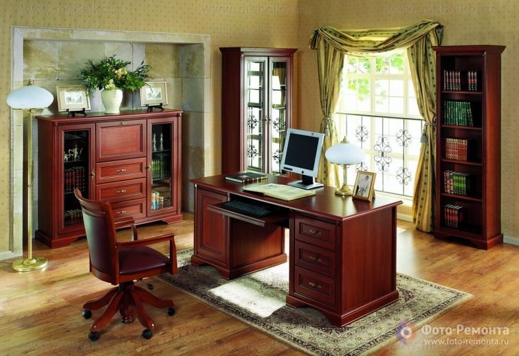 Главным достоинством компьютерного стола Стилиус является классический стиль и возможность полностью повторить всю красоту и роскошь натурального дерева. Строгие рамочные фасады всех элементов мебели Стилиус украшены легкой патиной и изящной лицевой фурнитурой. Изготовлена модель из ЛДСП, с элементами МДФ, в цвете черешня античная.