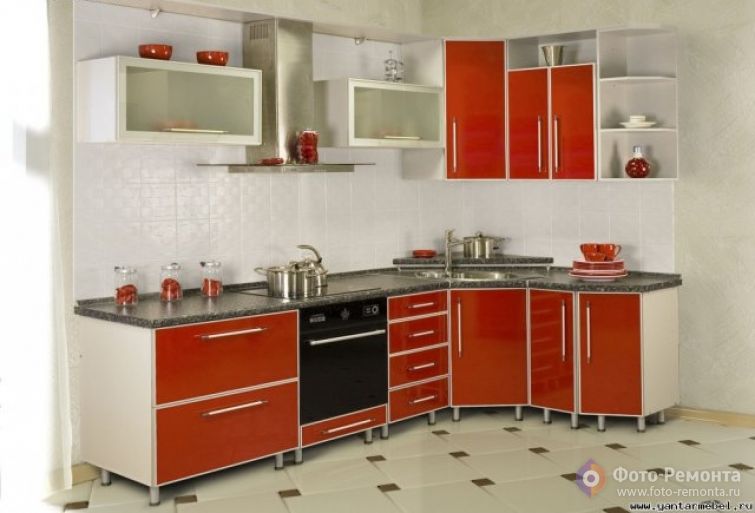 Возможные цвета фасадов кухни Альфа: красный, черно-белая роза, мята, оранжевый, бергамот. Фотография и описания предоставлены компанией Янтарь Мебель