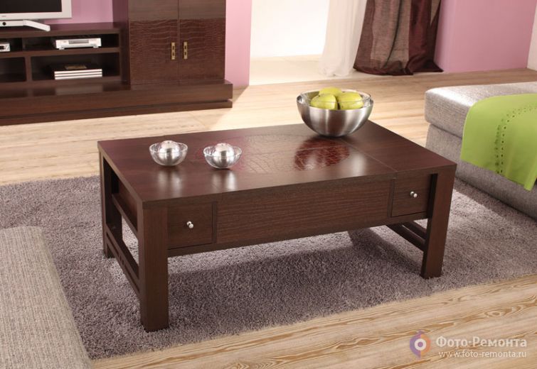 Представленный на фото журнальный столик с элементами гламурности - раздвижная столешница и отделка из искусственной кожи «арпатек» цвета «венге».