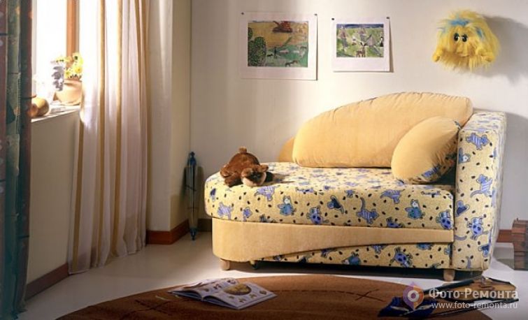 На фото представлен детский диван `Шерхан`, который имеет мягкие округлые формы, эргономичную конструкцию и экономящий место в детской комнате механизм раскладывания `альтернатива`. Фотография и описания предоставлены компанией Мебель Прогресс