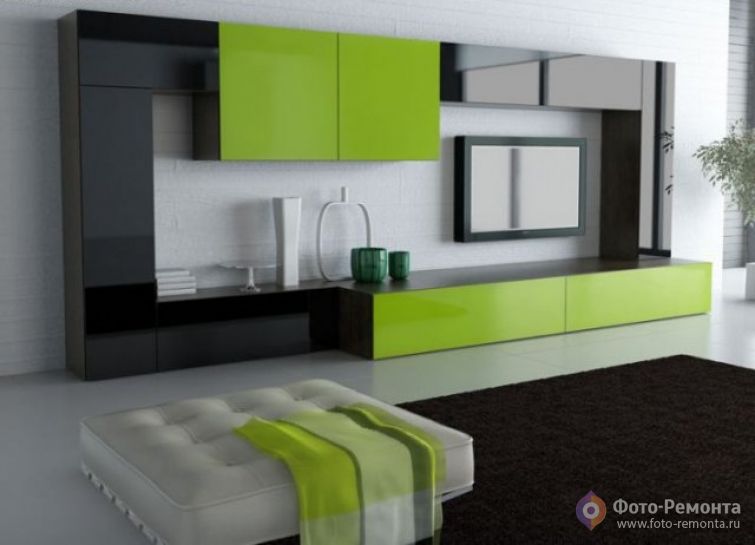 Цвет гостиной на фото: венге с фасадами из черного и зеленого стекла. Фотография и описания предоставлены компанией Костромамебель