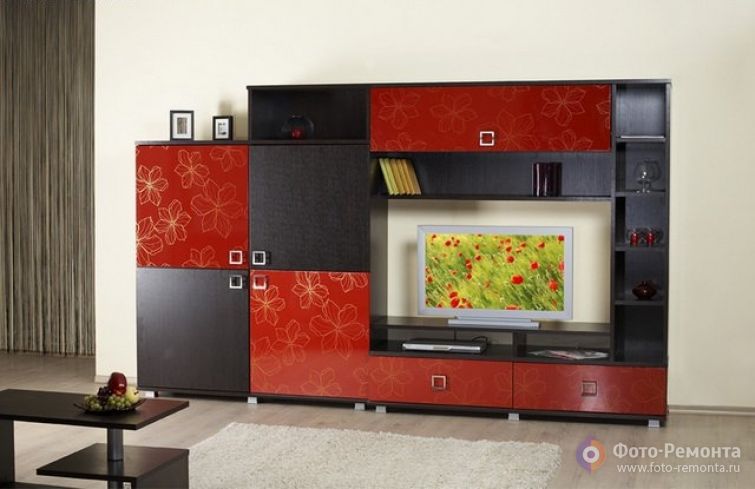 Мебельная стенка для гостиной Гармония. Цвет каркаса: венге, цвет фасада: коралловый цветок и венге.