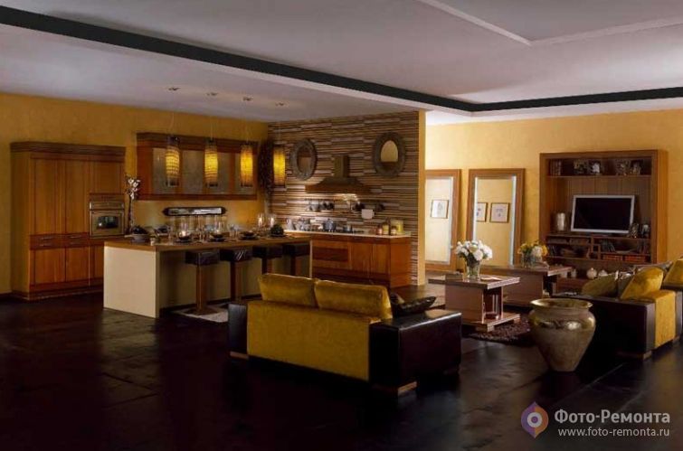 В кухонном гарнитуре Aruna читаются индийские мотивы. Это выражается во внешнем дизайне кухни: фасад с декоративным рисунком, который повторяет символ солнца, деревянные объемные слоники на вытяжке, выкрашенные в золотисто-янтарный цвет детали. На фотографии кухня объединена с жилым помещением с помощью различных элементов декора.