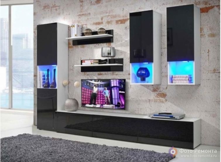 Современная стенка для гостиной Clip– яркое решение Вашего дома. Модель выполнена в ярких тонах из ламинированного ДСП: белый мат и черный глянец. В отделке витрин дизайнеры использовали прозрачное стекло толщиной 8мм , что предает мебели особую «легкость» и элегантность. Гарнитур включает в себя: три тумбы, высокий шкаф, подвесную витрину, две полки, подсветка (5 LED).